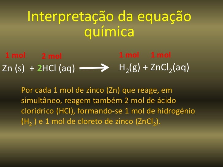 6. 6. Interpretação da equação química1 mol 2 mol 1 mol 1 molZn (s) + 2HCl (aq) H2(g) + ZnCl2(aq) Por cada 1 mol de zinco (Zn) que reage, em simultâneo, reagem também 2 mol de ácido clorídrico (HCl), formando-se 1 mol de hidrogénio (H2 ) e 1 mol de cloreto de zinco (ZnCl2).