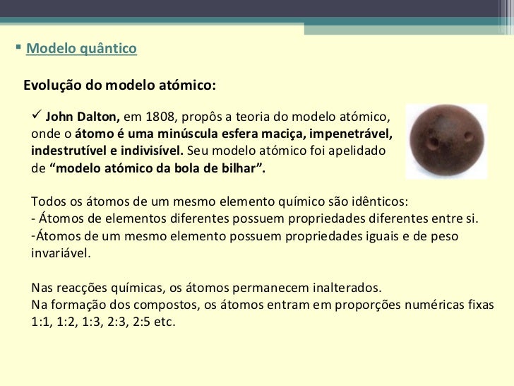 2. 2. <ul><li>Modelo quântico </li></ul>Evolução do modelo atómico: <ul><li>John Dalton, em 1808, propôs a teoria do modelo atómico, onde o átomo é uma minúscula esfera maciça, impenetrável, indestrutível e indivisível. Seu modelo atómico foi apelidado de “modelo atómico da bola de bilhar”. </li></ul><ul><li>Todos os átomos de um mesmo elemento químico são idênticos: </li></ul><ul><li>- Átomos de elementos diferentes possuem propriedades diferentes entre si. </li></ul><ul><li>Átomos de um mesmo elemento possuem propriedades iguais e de peso invariável. </li></ul><ul><li>Nas reacções químicas, os átomos permanecem inalterados. </li></ul><ul><li>Na formação dos compostos, os átomos entram em proporções numéricas fixas 1:1, 1:2, 1:3, 2:3, 2:5 etc. </li></ul>