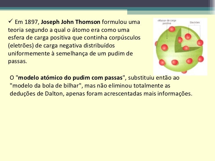 3. 3. <ul><li>Em 1897, Joseph John Thomson formulou uma teoria segundo a qual o átomo era como uma esfera de carga positiva que continha corpúsculos (eletrões) de carga negativa distribuídos uniformemente à semelhança de um pudim de passas. </li></ul>O &quot; modelo atómico do pudim com passas &quot;, substituiu então ao &quot;modelo da bola de bilhar&quot;, mas não eliminou totalmente as deduções de Dalton, apenas foram acrescentadas mais informações.