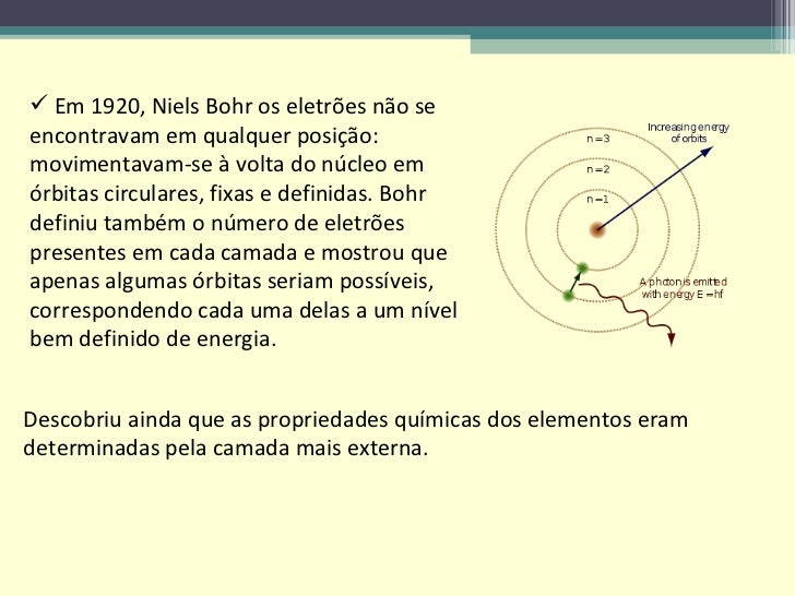 5. 5. <ul><li>Em 1920, Niels Bohr os eletrões não se encontravam em qualquer posição: movimentavam-se à volta do núcleo em órbitas circulares, fixas e definidas. Bohr definiu também o número de eletrões presentes em cada camada e mostrou que apenas algumas órbitas seriam possíveis, correspondendo cada uma delas a um nível bem definido de energia. </li></ul>Descobriu ainda que as propriedades químicas dos elementos eram determinadas pela camada mais externa.