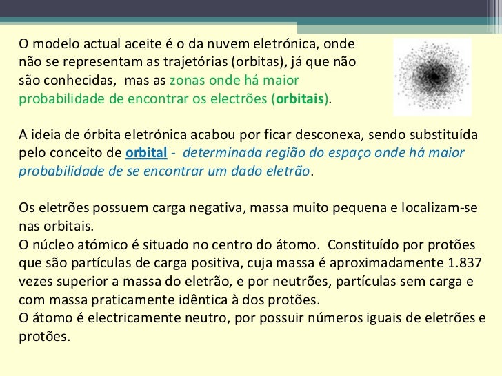 6. 6. O modelo actual aceite é o da nuvem eletrónica, onde não se representam as trajetórias (orbitas), já que não são conhecidas, mas as zonas onde há maior probabilidade de encontrar os electrões ( orbitais ) . A ideia de órbita eletrónica acabou por ficar desconexa, sendo substituída pelo conceito de orbital - determinada região do espaço onde há maior probabilidade de se encontrar um dado eletrão . Os eletrões possuem carga negativa, massa muito pequena e localizam-se nas orbitais. O núcleo atómico é situado no centro do átomo. Constituído por protões que são partículas de carga positiva, cuja massa é aproximadamente 1.837 vezes superior a massa do eletrão, e por neutrões, partículas sem carga e com massa praticamente idêntica à dos protões. O átomo é electricamente neutro, por possuir números iguais de eletrões e protões.
