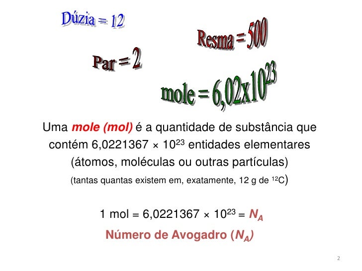 2. 2. 2<br />Dúzia = 12<br />Par = 2<br />Resma = 500<br />mole = 6,02x1023<br />Uma mole (mol) é a quantidade de substância que contém 6,0221367 × 1023 entidades elementares <br />(átomos, moléculas ou outras partículas) <br />(tantas quantas existem em, exatamente, 12 g de 12C)<br />1 mol = 6,0221367 × 1023 = NA<br />Número de Avogadro (NA)<br />