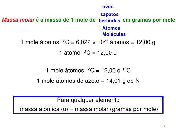 3. 3. 3<br />ovos<br />sapatos<br />Massa molaré a massa de 1 mole de em gramas por mole<br />berlindes<br />Átomos<br />Moléculas<br />1 mole átomos 12C = 6,022 × 1023 átomos = 12,00 g<br />1 átomo 12C = 12,00 u<br />1 mole átomos 12C = 12,00 g 12C<br />1 mole átomos de azoto = 14,01 g de N<br />Para qualquer elemento<br /> massa atómica (u) = massa molar (gramas por mole)<br />