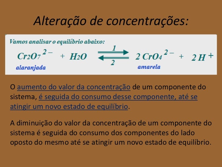 3. 3. Alteração de concentrações:O aumento do valor da concentração de um componente dosistema, é seguida do consumo desse componente, até seatingir um novo estado de equilíbrio.A diminuição do valor da concentração de um componente dosistema é seguida do consumo dos componentes do ladooposto do mesmo até se atingir um novo estado de equilíbrio.