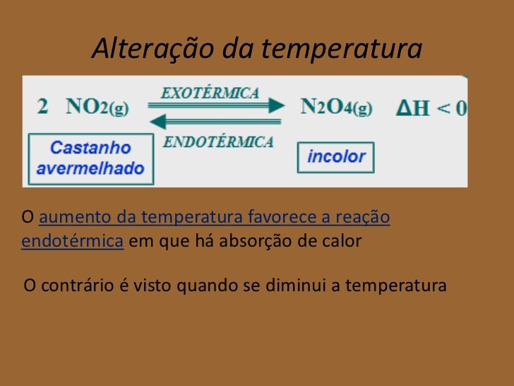 5. 5. Alteração da temperaturaO aumento da temperatura favorece a reaçãoendotérmica em que há absorção de calorO contrário é visto quando se diminui a temperatura
