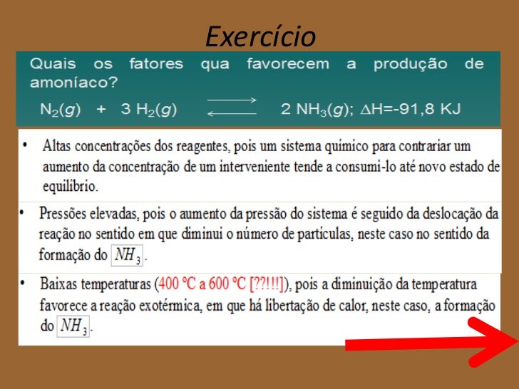 9. 9. ExercícioVerifica-se que um bom compromisso entrevelocidade da reação (temperatura alta)e grau de conversão de N2 e H2 em NH3 éobtido para temperaturas entre 400 ºC e600 ºC.