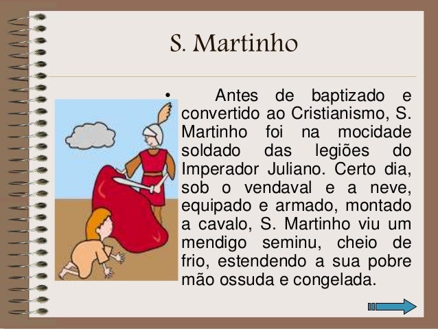 2. 2. S. Martinho • Antes de baptizado e convertido ao Cristianismo, S. Martinho foi na mocidade soldado das legiões do Imperador Juliano. Certo dia, sob o vendaval e a neve, equipado e armado, montado a cavalo, S. Martinho viu um mendigo seminu, cheio de frio, estendendo a sua pobre mão ossuda e congelada.