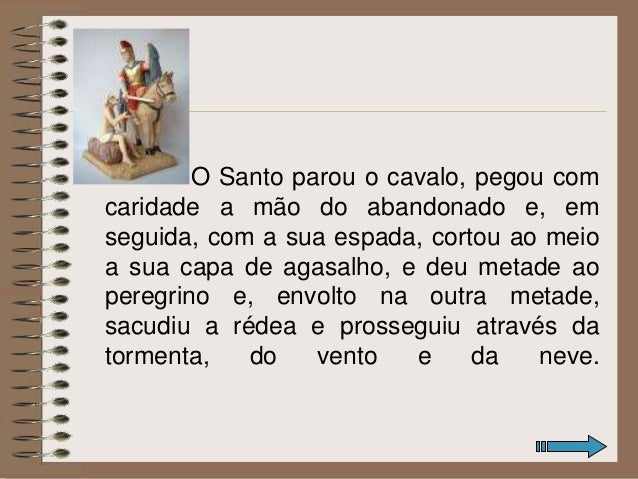 3. 3. O Santo parou o cavalo, pegou com caridade a mão do abandonado e, em seguida, com a sua espada, cortou ao meio a sua capa de agasalho, e deu metade ao peregrino e, envolto na outra metade, sacudiu a rédea e prosseguiu através da tormenta, do vento e da neve.