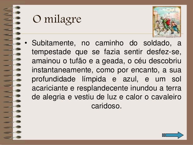 4. 4. O milagre • Subitamente, no caminho do soldado, a tempestade que se fazia sentir desfez-se, amainou o tufão e a geada, o céu descobriu instantaneamente, como por encanto, a sua profundidade límpida e azul, e um sol acariciante e resplandecente inundou a terra de alegria e vestiu de luz e calor o cavaleiro caridoso.