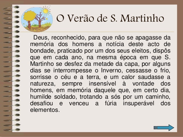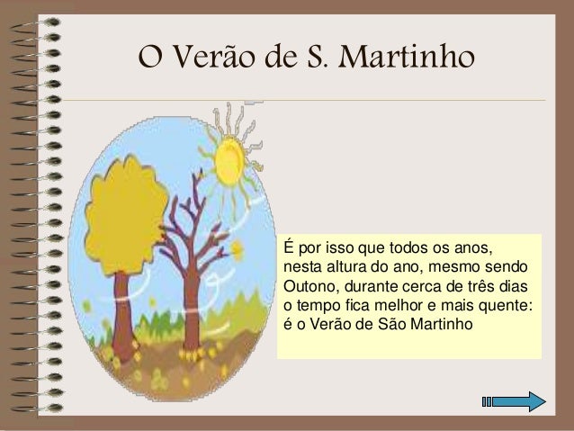 6. 6. O Verão de S. Martinho É por isso que todos os anos, nesta altura do ano, mesmo sendo Outono, durante cerca de três dias o tempo fica melhor e mais quente: é o Verão de São Martinho
