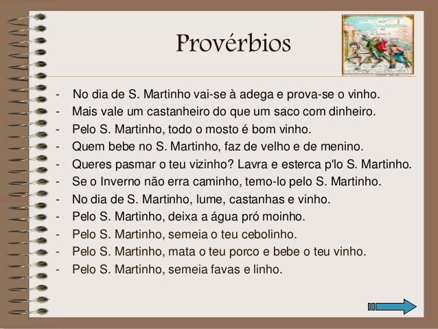 7. 7. Provérbios - No dia de S. Martinho vai-se à adega e prova-se o vinho. - Mais vale um castanheiro do que um saco com dinheiro. - Pelo S. Martinho, todo o mosto é bom vinho. - Quem bebe no S. Martinho, faz de velho e de menino. - Queres pasmar o teu vizinho? Lavra e esterca p'lo S. Martinho. - Se o Inverno não erra caminho, temo-lo pelo S. Martinho. - No dia de S. Martinho, lume, castanhas e vinho. - Pelo S. Martinho, deixa a água pró moinho. - Pelo S. Martinho, semeia o teu cebolinho. - Pelo S. Martinho, mata o teu porco e bebe o teu vinho. - Pelo S. Martinho, semeia favas e linho.