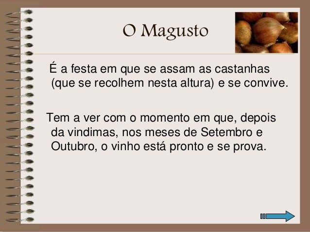 8. 8. O Magusto É a festa em que se assam as castanhas (que se recolhem nesta altura) e se convive. Tem a ver com o momento em que, depois da vindimas, nos meses de Setembro e Outubro, o vinho está pronto e se prova.
