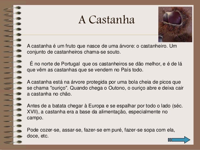 9. 9. A castanha é um fruto que nasce de uma árvore: o castanheiro. Um conjunto de castanheiros chama-se souto. É no norte de Portugal que os castanheiros se dão melhor, e é de lá que vêm as castanhas que se vendem no País todo. A castanha está na árvore protegida por uma bola cheia de picos que se chama "ouriço". Quando chega o Outono, o ouriço abre e deixa cair a castanha no chão. Antes de a batata chegar à Europa e se espalhar por todo o lado (séc. XVII), a castanha era a base da alimentação, especialmente no campo. Pode cozer-se, assar-se, fazer-se em puré, fazer-se sopa com ela, doce, etc. A Castanha