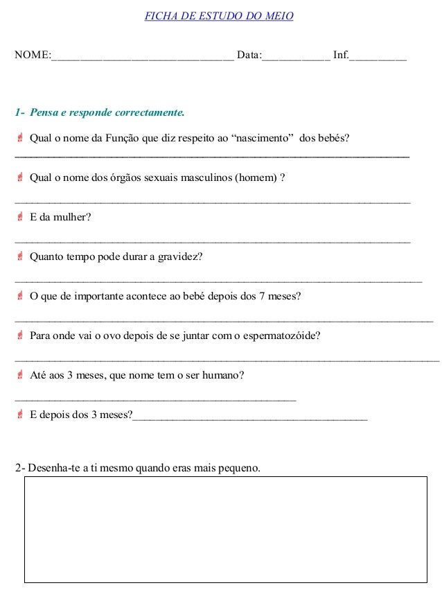 2. 2. 1- Pensa e responde correctamente.  Qual o nome da Função que diz respeito ao “nascimento” dos bebés? _____________________________________________________________________  Qual o nome dos órgãos sexuais masculinos (homem) ? _____________________________________________________________________  E da mulher? _____________________________________________________________________  Quanto tempo pode durar a gravidez? _______________________________________________________________________  O que de importante acontece ao bebé depois dos 7 meses? _________________________________________________________________________  Para onde vai o ovo depois de se juntar com o espermatozóide? __________________________________________________________________________  Até aos 3 meses, que nome tem o ser humano? _________________________________________________  E depois dos 3 meses?_________________________________________ FICHA DE ESTUDO DO MEIO NOME:________________________________ Data:____________ Inf.__________ 2- Desenha-te a ti mesmo quando eras mais pequeno.