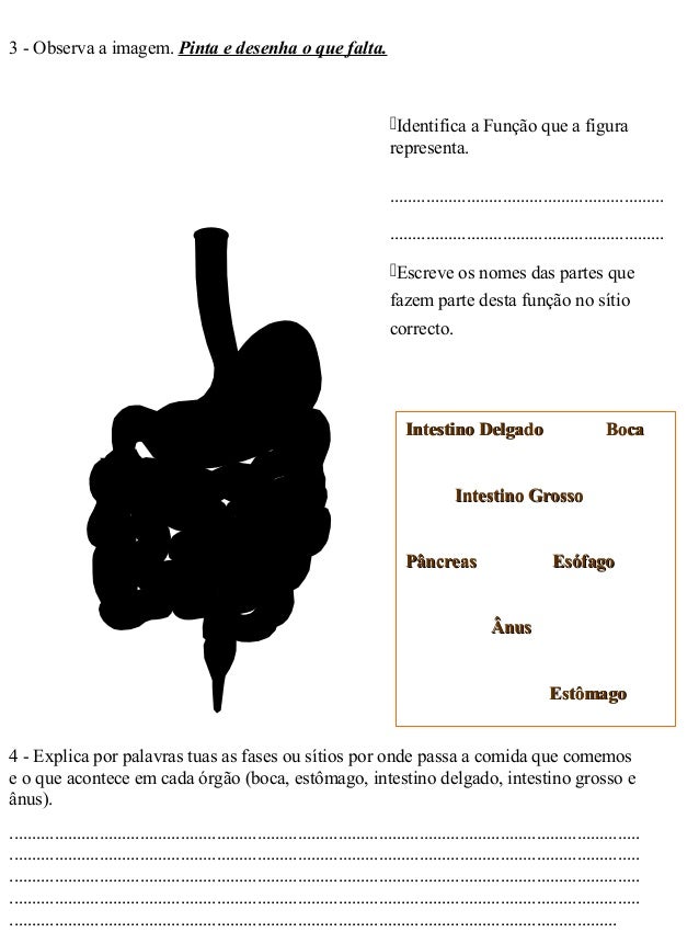 3. 3. 3 - Observa a imagem. Pinta e desenha o que falta. Identifica a Função que a figura representa. ............................................................. ............................................................. Escreve os nomes das partes que fazem parte desta função no sítio correcto. Intestino Delgado BocaIntestino Delgado Boca Intestino GrossoIntestino Grosso Pâncreas EsófagoPâncreas Esófago ÂnusÂnus EstômagoEstômago 4 - Explica por palavras tuas as fases ou sítios por onde passa a comida que comemos e o que acontece em cada órgão (boca, estômago, intestino delgado, intestino grosso e ânus). ............................................................................................................................................ ............................................................................................................................................ ............................................................................................................................................ ............................................................................................................................................ .......................................................................................................................................
