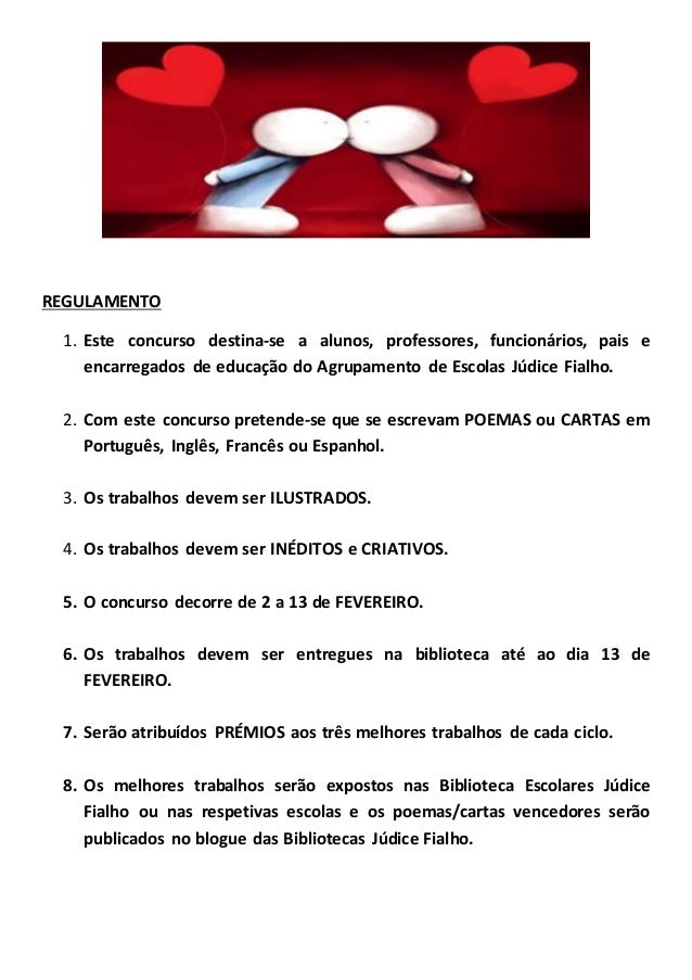 2. 2. REGULAMENTO 1. Este concurso destina-se a alunos, professores, funcionários, pais e encarregados de educação do Agrupamento de Escolas Júdice Fialho. 2. Com este concurso pretende-se que se escrevam POEMAS ou CARTAS em Português, Inglês, Francês ou Espanhol. 3. Os trabalhos devem ser ILUSTRADOS. 4. Os trabalhos devem ser INÉDITOS e CRIATIVOS. 5. O concurso decorre de 2 a 13 de FEVEREIRO. 6. Os trabalhos devem ser entregues na biblioteca até ao dia 13 de FEVEREIRO. 7. Serão atribuídos PRÉMIOS aos três melhores trabalhos de cada ciclo. 8. Os melhores trabalhos serão expostos nas Biblioteca Escolares Júdice Fialho ou nas respetivas escolas e os poemas/cartas vencedores serão publicados no blogue das Bibliotecas Júdice Fialho.