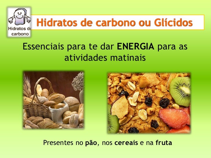 Hidratos de carbono ou GlícidosEssenciais para te dar ENERGIA para as          atividades matinais    Presentes no pão, no...