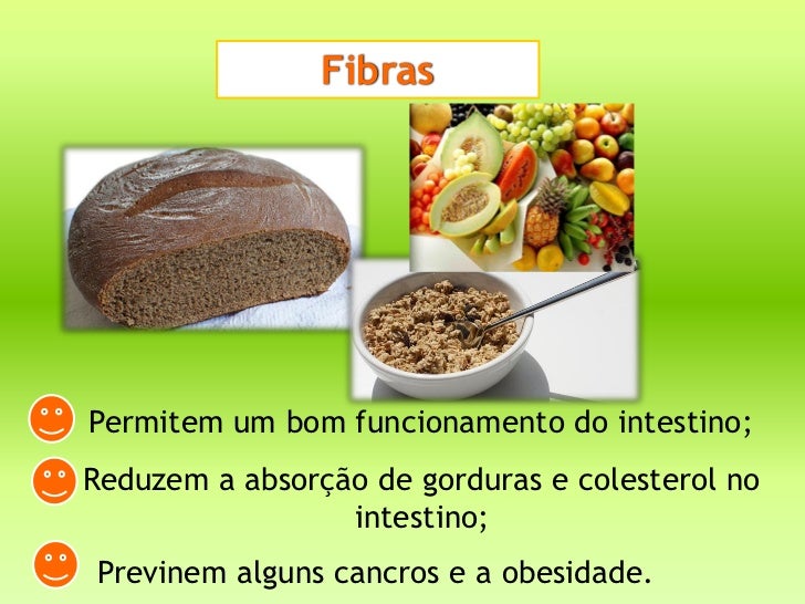 FibrasPermitem um bom funcionamento do intestino;Reduzem a absorção de gorduras e colesterol no                 intestino;...