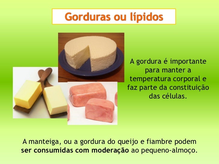 15. 15. Gorduras ou lípidos A gordura é importante para manter a temperatura corporal e faz parte da constituição das células.A manteiga, ou a gordura do queijo e fiambre podemser consumidas com moderação ao pequeno-almoço.