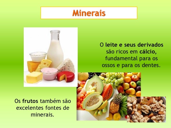 16. 16. Minerais O leite e seus derivados são ricos em cálcio, fundamental para os ossos e para os dentes.Os frutos também sãoexcelentes fontes de minerais.