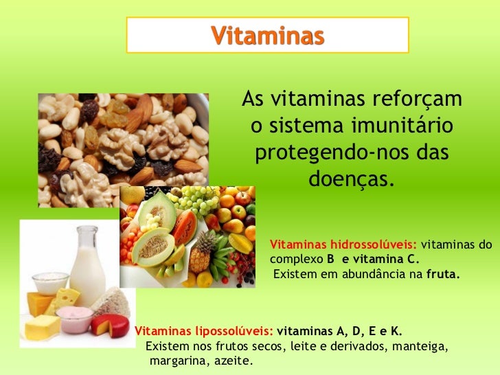 17. 17. Vitaminas As vitaminas reforçam o sistema imunitário protegendo-nos das doenças. Vitaminas hidrossolúveis: vitaminas do complexo B e vitamina C. Existem em abundância na fruta.Vitaminas lipossolúveis: vitaminas A, D, E e K. Existem nos frutos secos, leite e derivados, manteiga, margarina, azeite.