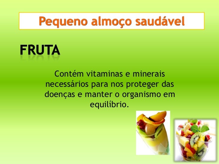 Pequeno almoço saudável  Contém vitaminas e mineraisnecessários para nos proteger dasdoenças e manter o organismo em      ...