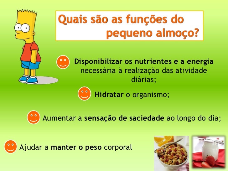 Quais são as funções do                   pequeno almoço?               Disponibilizar os nutrientes e a energia          ...