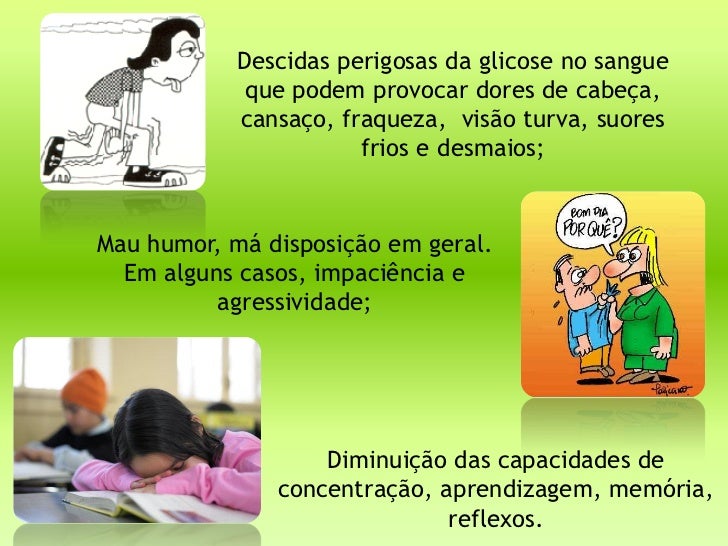 7. 7. Descidas perigosas da glicose no sangue que podem provocar dores de cabeça, cansaço, fraqueza, visão turva, suores frios e desmaios;Mau humor, má disposição em geral. Em alguns casos, impaciência e agressividade; Diminuição das capacidades de concentração, aprendizagem, memória, reflexos.