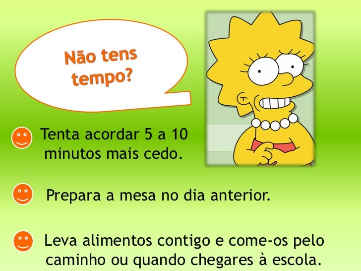 Tenta acordar 5 a 10 minutos mais cedo.Prepara a mesa no dia anterior.Leva alimentos contigo e come-os pelocaminho ou quan...