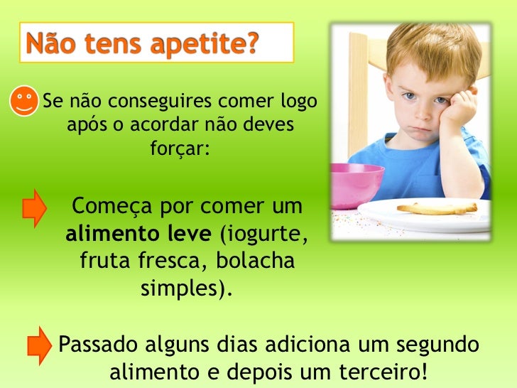 9. 9. Não tens apetite? Se não conseguires comer logo após o acordar não deves forçar: Começa por comer um alimento leve (iogurte, fruta fresca, bolacha simples). Passado alguns dias adiciona um segundo alimento e depois um terceiro!