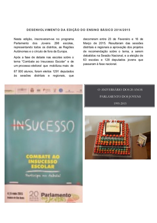 2. 2. DESENVOLVIMENTO DA EDIÇÃO DO ENSINO BÁSICO 2014/2015 Nesta edição, inscreveram-se no programa Parlamento dos Jovens 298 escolas, representando todos os distritos, as Regiões Autónomas e o círculo de fora da Europa. Após a fase de debate nas escolas sobre o tema “Combate ao Insucesso Escolar” e de um processo eleitoral que mobilizou mais de 87 000 alunos, foram eleitos 1291 deputados às sessões distritais e regionais, que decorreram entre 23 de Fevereiro e 16 de Março de 2015. Resultaram das sessões distritais e regionais a aprovação dos projetos de recomendação sobre o tema, a serem debatidos na Sessão Nacional, e a eleição de 63 escolas e 128 deputados jovens que passaram à fase nacional. O ANIVERSÁRIO DOS 20 ANOS PARLAMENTO DOS JOVENS 1995-2015