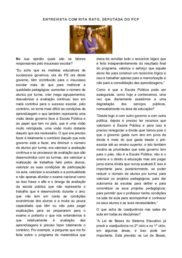 3. 3. ENTREVISTA COM RITA RATO, DEPUTADA DO PCP Na sua opinião quais são os fatores responsáveis pelo insucesso escolar? “Eu acho que as medidas educativas de sucessivos governos, ora do PS ora deste governo, têm contribuído para o insucesso escolar mais do que para melhorar a qualidade pedagógica: aumentar o número de alunos por turma, criar mega agrupamentos; desvalorizar a avaliação contínua; isso em nada contribui para o sucesso escolar, pelo contrário, só torna mais difícil as condições de aprendizagem o que também representa uma visão deste governo face á Escola Pública e ao papel que tem no país, que é uma visão muito retrógrada, uma visão muito distante daquilo que era necessário. O que era preciso fazer é totalmente o contrário daquilo que este governo está a fazer, era diminuir o número de alunos por turma; era valorizar a avaliação contínua e os processos de avaliação que são desenvolvidos com as turmas, era valorizar a realização de trabalhos feito pelos alunos, valorizar as suas condições de participação na aula, valorizar a acuidade e a pontualidade e não apenas afunilar o exame nacional como se isso fosse o alfa e o ómega da avaliação da escola pública que não representa o trabalho que é desenvolvido durante o ano; que não tem em conta as condições económicas dos alunos e a muita ou pouca capacidade que têm ou não para pagar explicações para se prepararem para o exame e portanto o que nós entendemos é que relativamente à avaliação das aprendizagens é preciso fazer totalmente o contrário. Por exemplo, a pergunta que me foi feita sobre o programa de matemática que deixa de conciliar todo o raciocínio lógico que é feito independentemente do resultado final do programa, valoriza o esforço que aquele aluno fez para construir um raciocínio lógico e isso é trabalhar apenas para a memorização e não para a consolidação das aprendizagens.” Como é que a Escola Pública pode ser assegurada, como hoje a conhecemos, uma vez que diariamente assistimos a uma degradação dos serviços públicos, nomeadamente na área da educação? “Desde logo é com outro governo e com outra política, depois é preciso ter recursos que valorizem a Escola Pública e para isso é preciso renegociar a dívida quer temos pois o que o governo gasta num ano em juros da divida é mais do que gasta desde o pré- escolar até ao ensino superior, e isto também mostra as prioridades que este governo tem para o pais, não é a Escola Pública; não é o ensino e o direito á educação mas sim pagar juros duma dívida que nunca acabará E isso é importante para, posteriormente, se poder reduzir o número de alunos por turma; para valorizar os projetos pedagógicos; para dar autonomia às escolas para definir e para concretizar os seus projetos pedagógicos; para permitir que o professor tenha condições na sala de aula para acompanhar e conhecer os seus alunos e as suas necessidades.” O que acha da coadjuvância nas salas de aula em todas as disciplinas? “A Lei de Bases do Sistema Educativo já prevê a coadjuvância no 2º ciclo e no 1º ciclo, em algumas áreas, e isso pode ser importante. Está previsto na Lei de Bases,