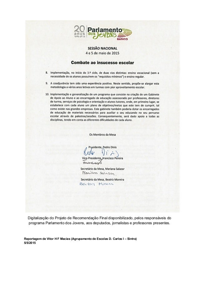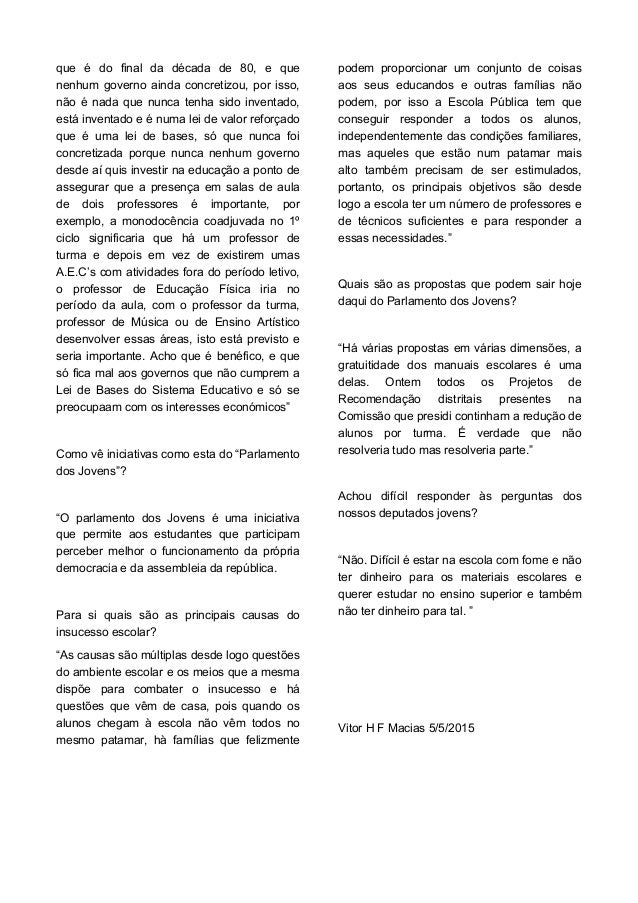 4. 4. que é do final da década de 80, e que nenhum governo ainda concretizou, por isso, não é nada que nunca tenha sido inventado, está inventado e é numa lei de valor reforçado que é uma lei de bases, só que nunca foi concretizada porque nunca nenhum governo desde aí quis investir na educação a ponto de assegurar que a presença em salas de aula de dois professores é importante, por exemplo, a monodocência coadjuvada no 1º ciclo significaria que há um professor de turma e depois em vez de existirem umas A.E.C’s com atividades fora do período letivo, o professor de Educação Física iria no período da aula, com o professor da turma, professor de Música ou de Ensino Artístico desenvolver essas áreas, isto está previsto e seria importante. Acho que é benéfico, e que só fica mal aos governos que não cumprem a Lei de Bases do Sistema Educativo e só se preocupaam com os interesses económicos” Como vê iniciativas como esta do “Parlamento dos Jovens”? “O parlamento dos Jovens é uma iniciativa que permite aos estudantes que participam perceber melhor o funcionamento da própria democracia e da assembleia da república. Para si quais são as principais causas do insucesso escolar? “As causas são múltiplas desde logo questões do ambiente escolar e os meios que a mesma dispõe para combater o insucesso e há questões que vêm de casa, pois quando os alunos chegam à escola não vêm todos no mesmo patamar, hà famílias que felizmente podem proporcionar um conjunto de coisas aos seus educandos e outras famílias não podem, por isso a Escola Pública tem que conseguir responder a todos os alunos, independentemente das condições familiares, mas aqueles que estão num patamar mais alto também precisam de ser estimulados, portanto, os principais objetivos são desde logo a escola ter um número de professores e de técnicos suficientes e para responder a essas necessidades.” Quais são as propostas que podem sair hoje daqui do Parlamento dos Jovens? “Há várias propostas em várias dimensões, a gratuitidade dos manuais escolares é uma delas. Ontem todos os Projetos de Recomendação distritais presentes na Comissão que presidi continham a redução de alunos por turma. É verdade que não resolveria tudo mas resolveria parte.” Achou difícil responder às perguntas dos nossos deputados jovens? “Não. Difícil é estar na escola com fome e não ter dinheiro para os materiais escolares e querer estudar no ensino superior e também não ter dinheiro para tal. ” Vitor H F Macias 5/5/2015