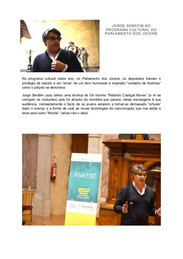 5. 5. JORGE SERAFIM NO PROGRAMA CULTURAL DO PARLAMENTO DOS JOVENS No programa cultural deste ano, no Parlamento dos Jovens, os deputados tiveram o privilégio de assistir a um “show” de um bem humorado e inspirado “contador de histórias” como o próprio se denomina. Jorge Serafim usou talvez uma técnica de Gil vicente “Ridendo Castigat Mores” (a rir se corrigem os costumes) pois foi através da comédia que passou várias mensagens à sua audiência, nomeadamente o facto de os jovens estarem a tornar-se demasiado “virtuais” dado o avanço e a forma de usar as novas tecnologias de comunicação que nos estão a levar para outro “Mundo”, talvez não o ideal.