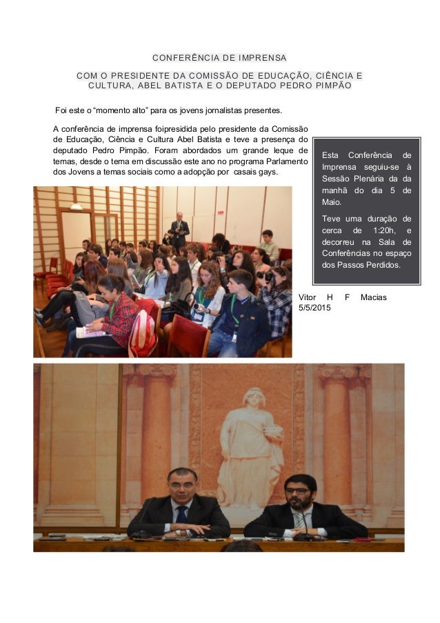 6. 6. CONFERÊNCIA DE IMPRENSA COM O PRESIDENTE DA COMISSÃO DE EDUCAÇÃO, CIÊNCIA E CULTURA, ABEL BATISTA E O DEPUTADO PEDRO PIMPÃO Foi este o “momento alto” para os jovens jornalistas presentes. A conferência de imprensa foipresidida pelo presidente da Comissão de Educação, Ciência e Cultura Abel Batista e teve a presença do deputado Pedro Pimpão. Foram abordados um grande leque de temas, desde o tema em discussão este ano no programa Parlamento dos Jovens a temas sociais como a adopção por casais gays. Vitor H F Macias 5/5/2015 Esta Conferência de Imprensa seguiu-se à Sessão Plenária da da manhã do dia 5 de Maio. Teve uma duração de cerca de 1:20h, e decorreu na Sala de Conferências no espaço dos Passos Perdidos.