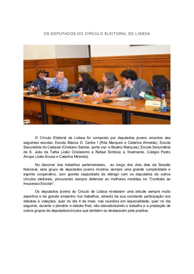 7. 7. OS DEPUTADOS DO CÍRCULO ELEITORAL DE LISBOA O Círculo Eleitoral de Lisboa foi composto por deputados jovens oriundos das seguintes escolas: Escola Básica D. Carlos I (Rita Marques e Catarina Almeida), Escola Secundária do Cadaval (Cristiano Santos- porta voz- e Beatriz Marques), Escola Secundária de S. João da Talha (João Crisóstomo e Rafael Simões) e, finalmente, Colégio Pedro Arrupe (João Sousa e Catarina Miranda). No decorrer dos trabalhos parlamentares, ao longo dos dois dias da Sessão Nacional, este grupo de deputados jovens mostrou sempre uma grande cumplicidade e espírito cooperativo, com grande capacidade de diálogo com os deputados de outros círculos eleitorais, procurando sempre defender as melhores medidas no “Combate ao Insucesso Escolar”. Os deputados jovens do Círculo de Lisboa revelaram uma atitude sempre muito assertiva e de grande empenho nos trabalhos, através da sua constante participação nos debates e votações, quer no dia 4 de maio, nas reuniões em especialidade, quer no dia seguinte, durante o plenário e debate final, não desvalorizando o trabalho e a prestação de outros grupos de deputados/círculos que também se destacaram pela positiva.