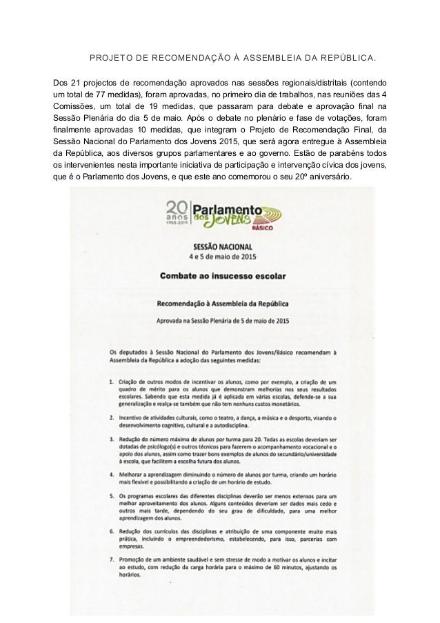 8. 8. PROJETO DE RECOMENDAÇÃO À ASSEMBLEIA DA REPÚBLICA. Dos 21 projectos de recomendação aprovados nas sessões regionais/distritais (contendo um total de 77 medidas), foram aprovadas, no primeiro dia de trabalhos, nas reuniões das 4 Comissões, um total de 19 medidas, que passaram para debate e aprovação final na Sessão Plenária do dia 5 de maio. Após o debate no plenário e fase de votações, foram finalmente aprovadas 10 medidas, que integram o Projeto de Recomendação Final, da Sessão Nacional do Parlamento dos Jovens 2015, que será agora entregue à Assembleia da República, aos diversos grupos parlamentares e ao governo. Estão de parabéns todos os intervenientes nesta importante iniciativa de participação e intervenção cívica dos jovens, que é o Parlamento dos Jovens, e que este ano comemorou o seu 20º aniversário.