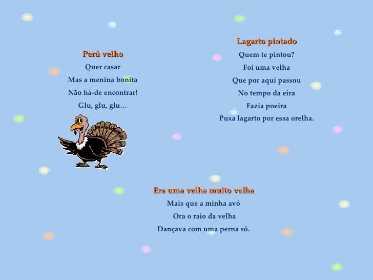 10. 10. Perú velho Quer casar Mas a menina bonita Não há-de encontrar! Glu, glu, glu… Era uma velha muito velha Mais que a minha avó Ora o raio da velha Dançava com uma perna só. Lagarto pintado Quem te pintou? Foi uma velha Que por aqui passou No tempo da eira Fazia poeira Puxa lagarto por essa orelha.