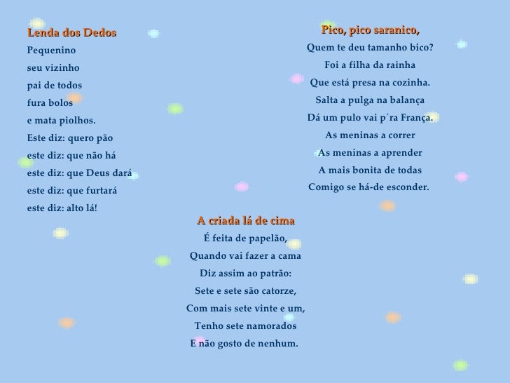 11. 11. Pico, pico saranico, Quem te deu tamanho bico? Foi a filha da rainha Que está presa na cozinha. Salta a pulga na balança Dá um pulo vai p´ra França. As meninas a correr As meninas a aprender A mais bonita de todas Comigo se há-de esconder. Lenda dos Dedos Pequenino seu vizinho pai de todos fura bolos e mata piolhos. Este diz: quero pão este diz: que não há este diz: que Deus dará este diz: que furtará este diz: alto lá! A criada lá de cima É feita de papelão, Quando vai fazer a cama Diz assim ao patrão: Sete e sete são catorze, Com mais sete vinte e um, Tenho sete namorados E não gosto de nenhum.
