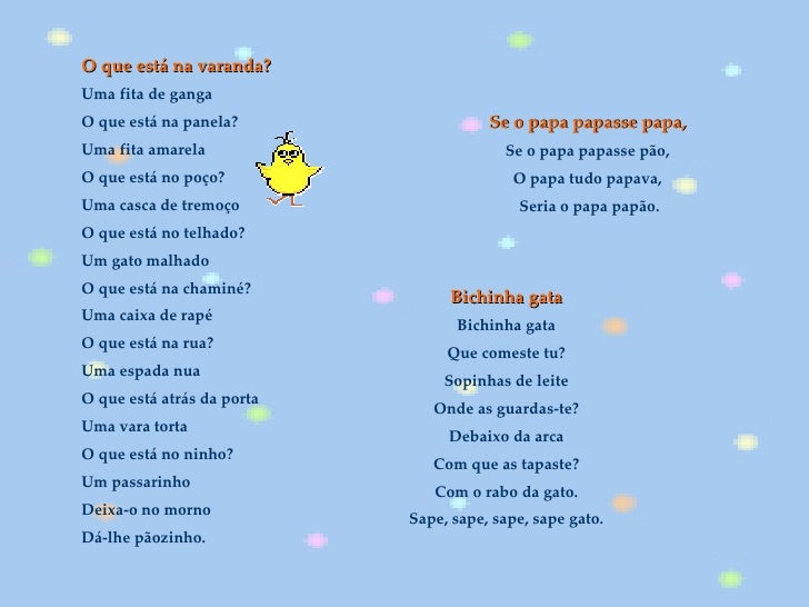 12. 12. O que está na varanda? Uma fita de ganga O que está na panela? Uma fita amarela O que está no poço? Uma casca de tremoço O que está no telhado? Um gato malhado O que está na chaminé? Uma caixa de rapé O que está na rua? Uma espada nua O que está atrás da porta Uma vara torta O que está no ninho? Um passarinho Deixa-o no morno Dá-lhe pãozinho. Se o papa papasse papa, Se o papa papasse pão, O papa tudo papava, Seria o papa papão. Bichinha gata Bichinha gata Que comeste tu? Sopinhas de leite Onde as guardas-te? Debaixo da arca Com que as tapaste? Com o rabo da gato. Sape, sape, sape, sape gato.