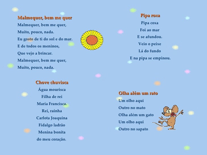 14. 14. Malmequer, bem me quer Malmequer, bem me quer, Muito, pouco, nada. Eu gosto de ti do sol e do mar. E de todos os meninos, Que vejo a brincar. Malmequer, bem me quer, Muito, pouco, nada. Olha além um rato Um olho aqui Outro no mato Olha além um gato Um olho aqui Outro no sapato . Pipa roxa Pipa coxa Foi ao mar E se afundou. Veio o peixe Lá do fundo E na pipa se empinou. Chove chuvisca Água mourisca Filha de rei Maria Francisca. Rei, rainha Carlota Joaquina Fidalgo ladrão Menina bonita do meu coração.