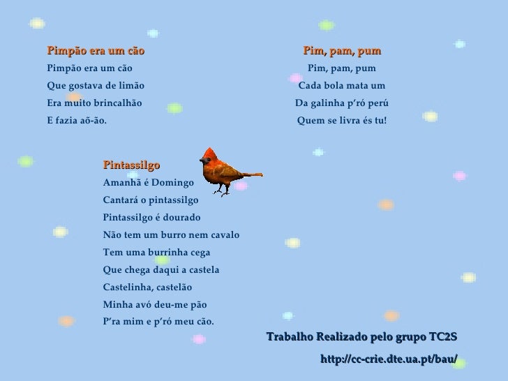 15. 15. Pim, pam, pum Pim, pam, pum Cada bola mata um Da galinha p’ró perú Quem se livra és tu! Pimpão era um cão Pimpão era um cão Que gostava de limão Era muito brincalhão E fazia aõ-ão. Pintassilgo Amanhã é Domingo Cantará o pintassilgo Pintassilgo é dourado Não tem um burro nem cavalo Tem uma burrinha cega Que chega daqui a castela Castelinha, castelão Minha avó deu-me pão P’ra mim e p’ró meu cão . Trabalho Realizado pelo grupo TC2S http://cc-crie.dte.ua.pt/bau/