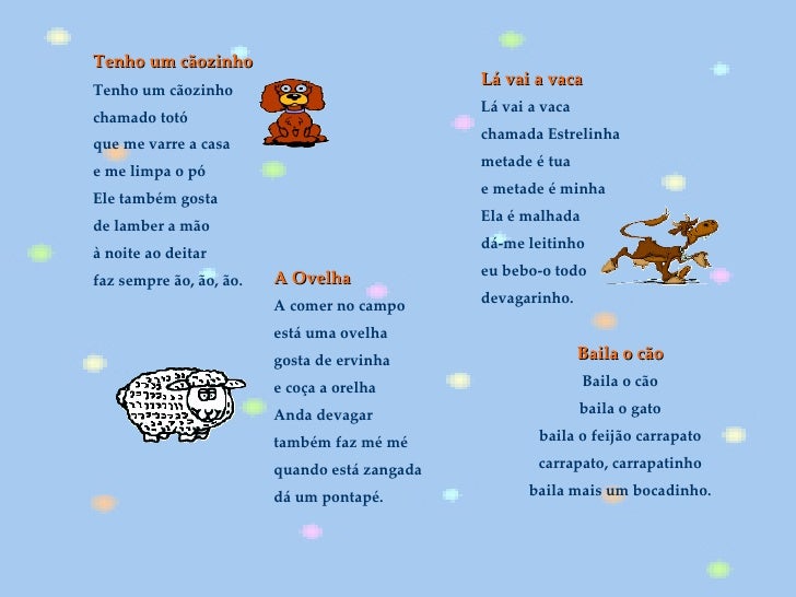 2. 2. <ul><li>Tenho um cãozinho </li></ul><ul><li>Tenho um cãozinho </li></ul><ul><li>chamado totó </li></ul><ul><li>que me varre a casa </li></ul><ul><li>e me limpa o pó </li></ul><ul><li>Ele também gosta </li></ul><ul><li>de lamber a mão </li></ul><ul><li>à noite ao deitar </li></ul><ul><li>faz sempre ão, ão, ão. </li></ul><ul><li>  </li></ul>Lá vai a vaca Lá vai a vaca chamada Estrelinha metade é tua e metade é minha Ela é malhada dá-me leitinho eu bebo-o todo devagarinho.   A Ovelha A comer no campo está uma ovelha gosta de ervinha e coça a orelha Anda devagar também faz mé mé quando está zangada  dá um pontapé.   Baila o cão Baila o cão baila o gato baila o feijão carrapato carrapato, carrapatinho baila mais um bocadinho. A Ovelha