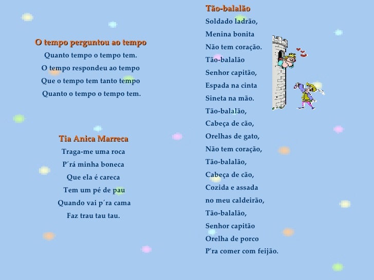 5. 5. O tempo perguntou ao tempo Quanto tempo o tempo tem. O tempo respondeu ao tempo Que o tempo tem tanto tempo Quanto o tempo o tempo tem. Tia Anica Marreca Traga-me uma roca P´rá minha boneca Que ela é careca Tem um pé de pau Quando vai p´ra cama Faz trau tau tau. Tão-balalão Soldado ladrão, Menina bonita Não tem coração. Tão-balalão Senhor capitão, Espada na cinta Sineta na mão. Tão-balalão, Cabeça de cão, Orelhas de gato, Não tem coração, Tão-balalão, Cabeça de cão, Cozida e assada no meu caldeirão, Tão-balalão, Senhor capitão Orelha de porco P'ra comer com feijão.