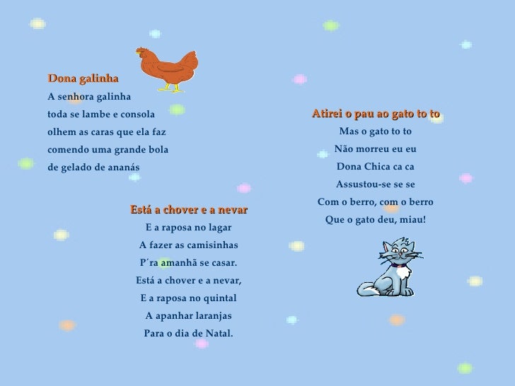 7. 7. Dona galinha A senhora galinha toda se lambe e consola olhem as caras que ela faz comendo uma grande bola de gelado de ananás Está a chover e a nevar E a raposa no lagar A fazer as camisinhas P´ra amanhã se casar. Está a chover e a nevar, E a raposa no quintal A apanhar laranjas Para o dia de Natal. Atirei o pau ao gato to to Mas o gato to to Não morreu eu eu Dona Chica ca ca Assustou-se se se Com o berro, com o berro Que o gato deu, miau!