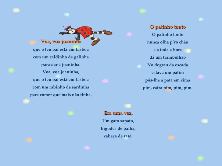 8. 8. O patinho tonto O patinho tonto nunca olha p´ro chão e a toda a hora dá um trambolhão No degrau da escada estava um patim pôs-lhe a pata em cima pim, catra pim, pim, pim. Era uma vez, Um gato sapato, bigodes de palha, cabeça de rato. Voa, voa joaninha que o teu pai está em Lisboa com um caldinho de galinha para dar à joaninha. Voa, voa joaninha, que o teu pai está em Lisboa com um rabinho de sardinha para comer que mais não tinha.