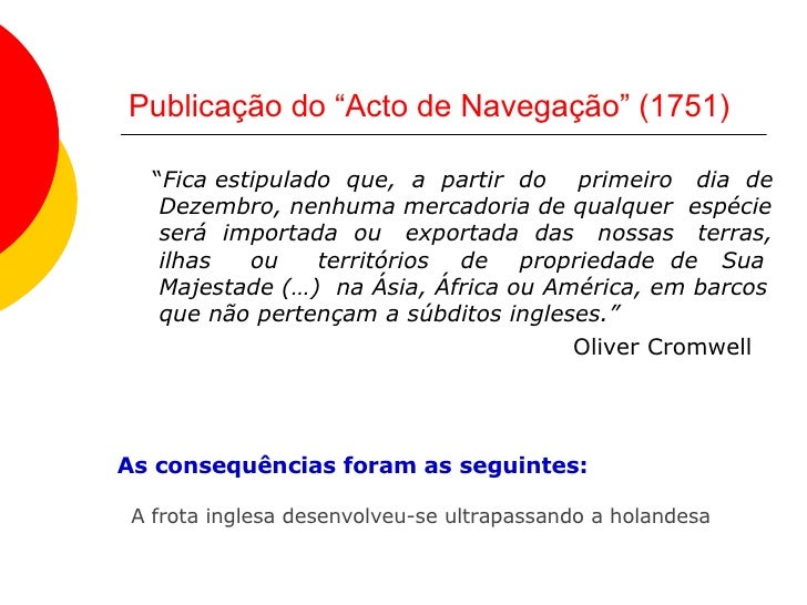 4. 4. Publicação do “Acto de Navegação” (1751) <ul><li>“ Fica estipulado que, a partir do primeiro dia de Dezembro, nenhuma mercadoria de qualquer espécie será importada ou exportada das nossas terras, ilhas ou territórios de propriedade de Sua Majestade (…) na Ásia, África ou América, em barcos que não pertençam a súbditos ingleses.” </li></ul><ul><li>Oliver Cromwell </li></ul>A frota inglesa desenvolveu-se ultrapassando a holandesa As consequências foram as seguintes: