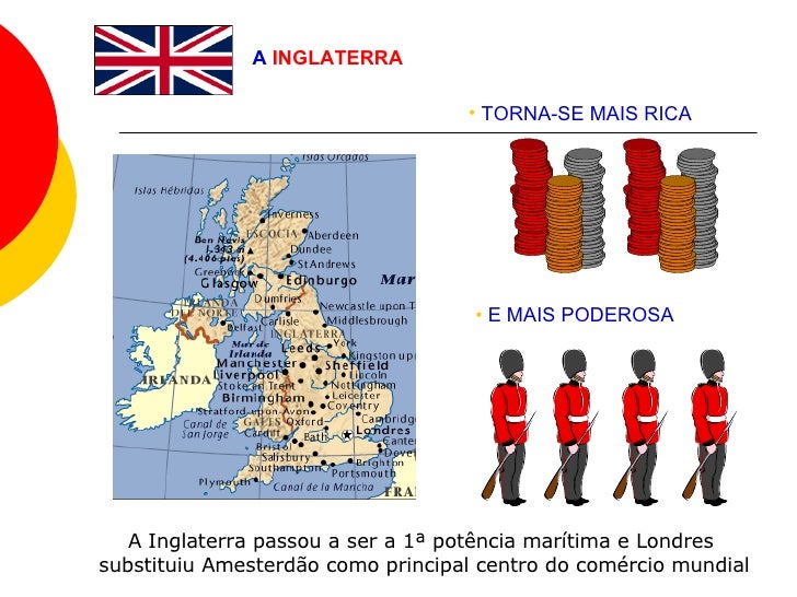 5. 5. A INGLATERRA <ul><li>TORNA-SE MAIS RICA </li></ul><ul><li>E MAIS PODEROSA </li></ul>A Inglaterra passou a ser a 1ª potência marítima e Londres substituiu Amesterdão como principal centro do comércio mundial