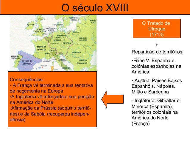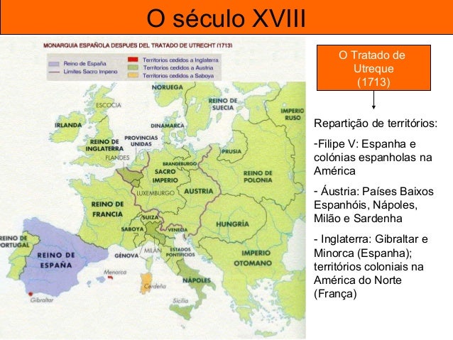 14. 14. O século XVIII Conflitos políticos O Tratado de Utreque (1713) Repartição de territórios: -Filipe V: Espanha e colónias espanholas na América - Áustria: Países Baixos Espanhóis, Nápoles, Milão e Sardenha - Inglaterra: Gibraltar e Minorca (Espanha); territórios coloniais na América do Norte (França)