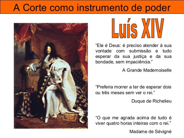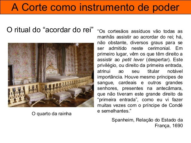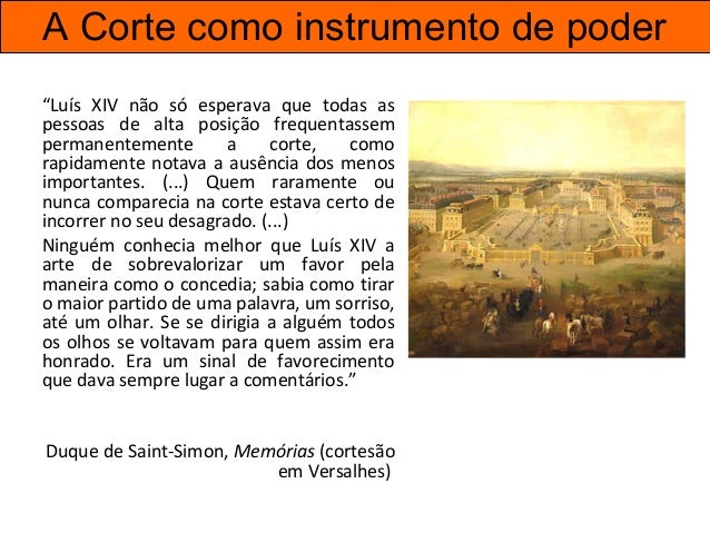 20. 20. A Corte como instrumento de poder “Luís XIV não só esperava que todas as pessoas de alta posição frequentassem permanentemente a corte, como rapidamente notava a ausência dos menos importantes. (...) Quem raramente ou nunca comparecia na corte estava certo de incorrer no seu desagrado. (...) Ninguém conhecia melhor que Luís XIV a arte de sobrevalorizar um favor pela maneira como o concedia; sabia como tirar o maior partido de uma palavra, um sorriso, até um olhar. Se se dirigia a alguém todos os olhos se voltavam para quem assim era honrado. Era um sinal de favorecimento que dava sempre lugar a comentários.” Duque de Saint-Simon, Memórias (cortesão em Versalhes)
